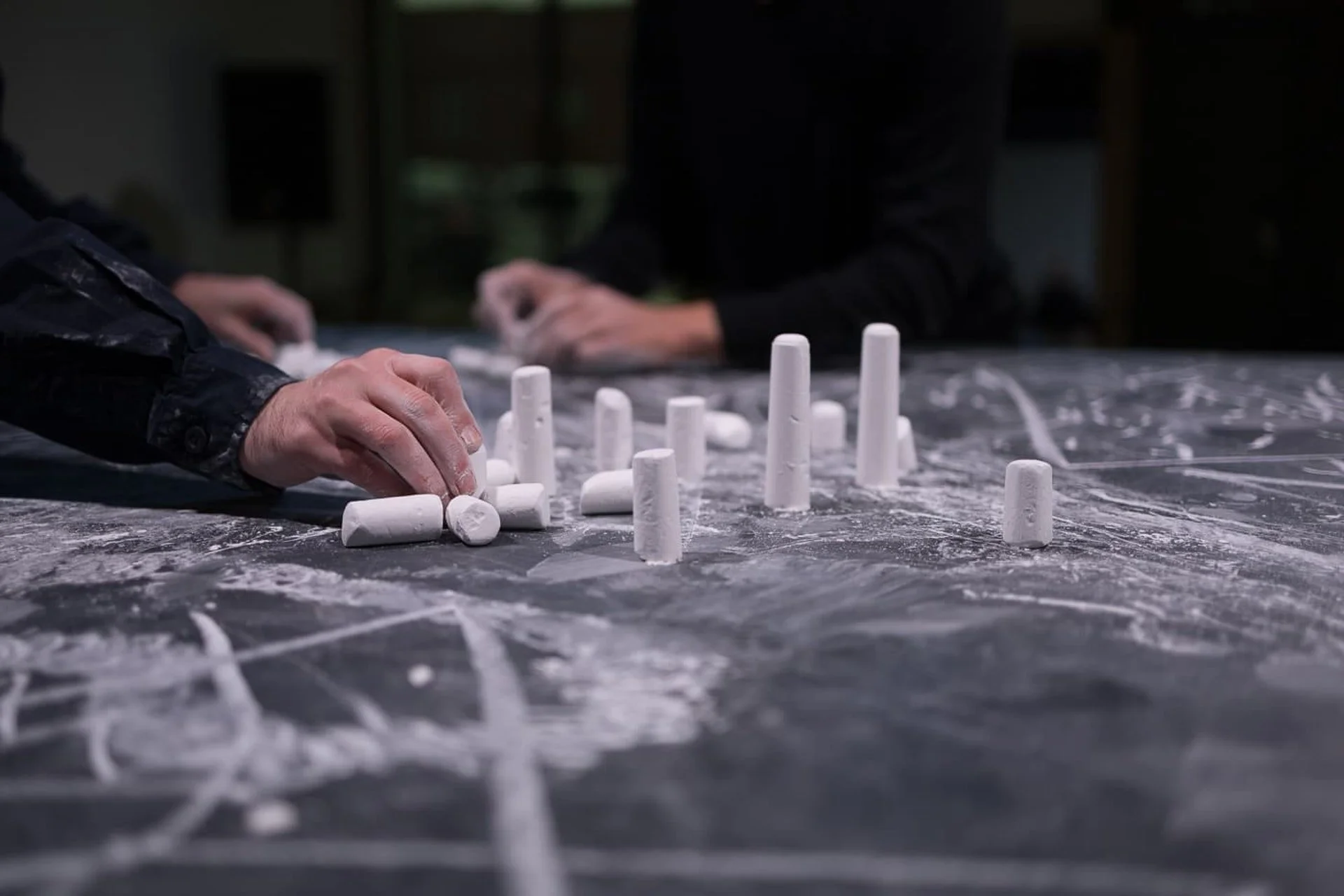 Done and Dusted is an intimate 40-minute performance for audiences from 10-80 people, depending on the location and seating arrangements. Performers and audience gather together around a large table as the work emerges from the interplay of marking and erasing, of hands, sounds and bodies. With chalk and cloth, the tabletop becomes a canvas and drawing becomes a choreography.